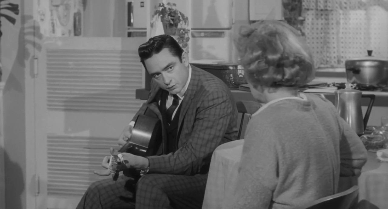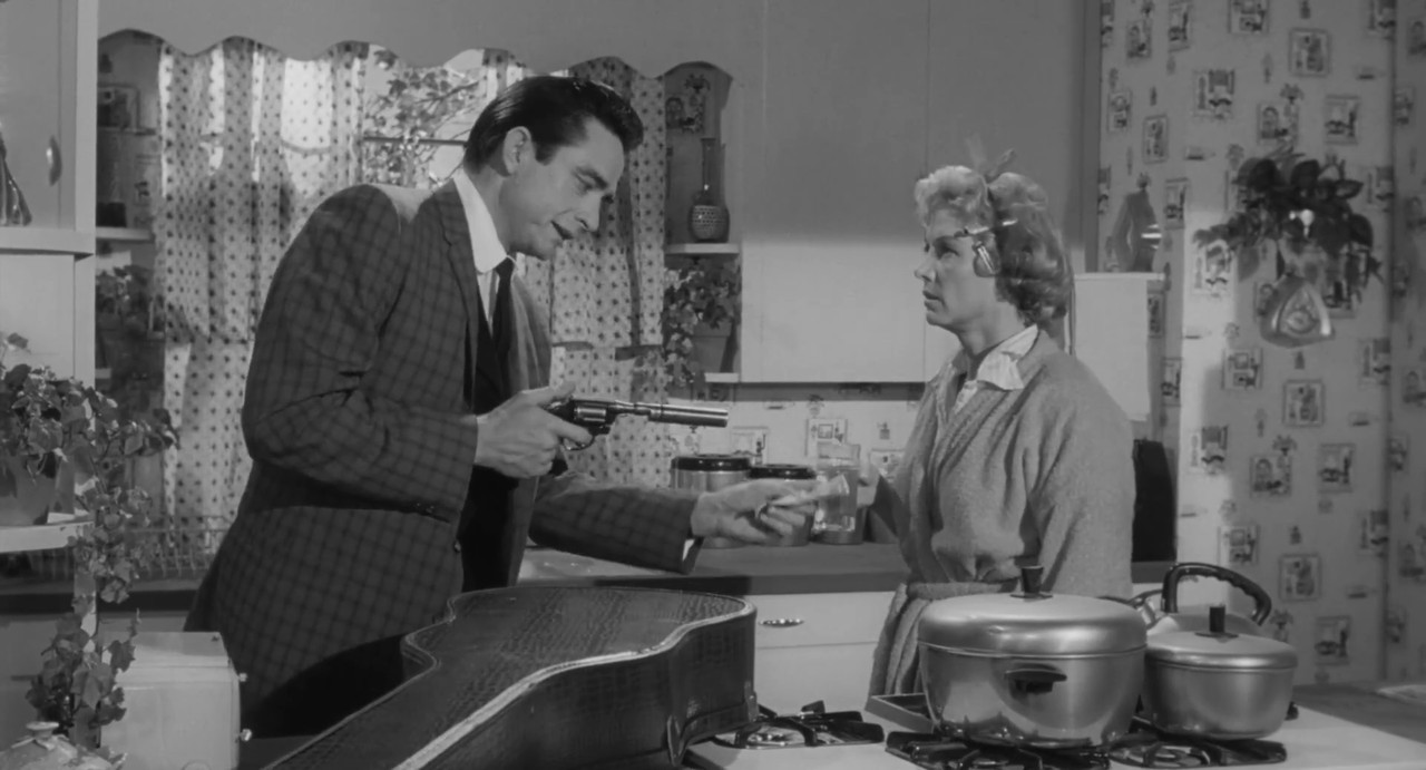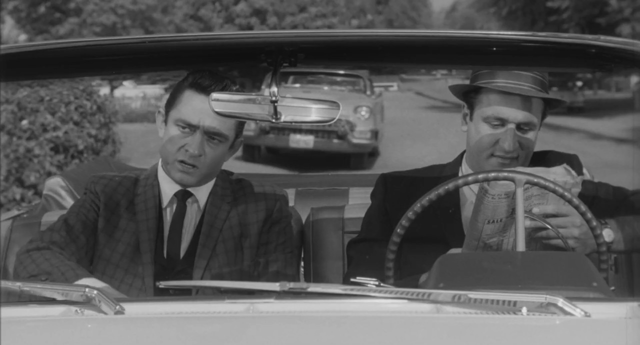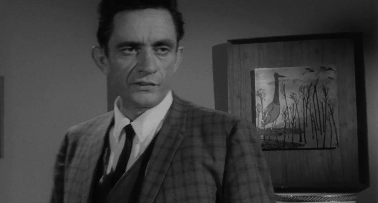 There are certain coincidences with the real Johnny, the action supposedly takes place in the wilderness, but in fact this is a suburbs of the ideal American dream. Johnny plays a criminal and a musician who pretends to be a traveling salesman. In fact, before starting his musical career, Cash also worked as a door-to-door salesman and sold something like refrigerators. But he was not very successful in this, he even discouraged buying the product if he saw that it was too expensive for people. However, he has always been successful when it comes to promoting his own talent and himself as an artist. Cash is a good actor, and it’s very unusual to see him in the role of a purely negative character. Here he is cruel and even mean-spirited, despises the entire business class, disparages the females and tells very sharp jokes about his victim: